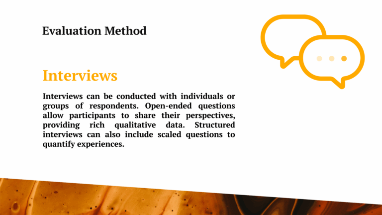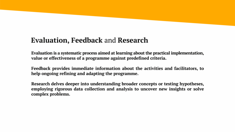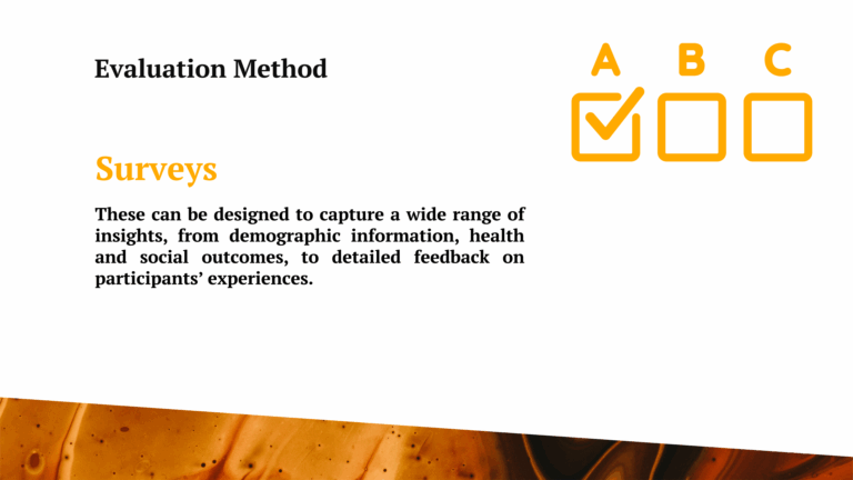When selecting methods, consider your evaluation’s objectives and the type of information you want to gather. For example, if you want to understand how participants feel about the programme, you might conduct interviews to hear their perspectives. If measuring the programme’s overall impact is your goal, surveys can help collect data from many people quickly.